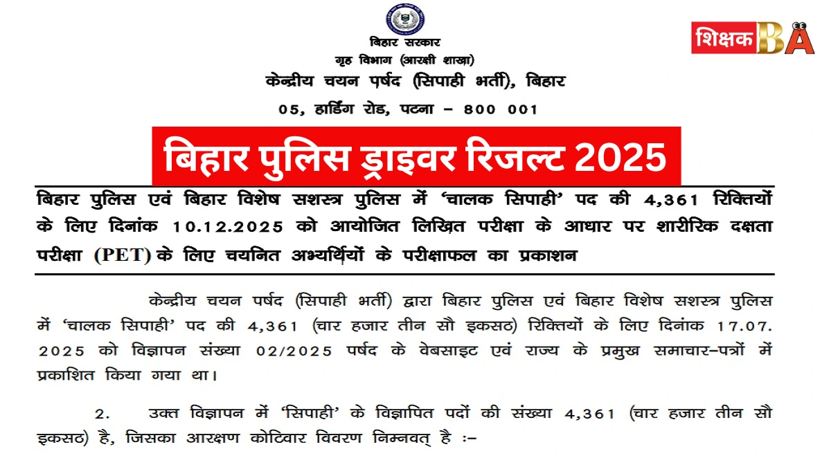 सेंट्रल सिलेक्शन बोर्ड ऑफ कांस्टेबल्स (CSBC) ने बिहार पुलिस में कांस्टेबल ड्राइवर पद की भर्ती के लिए 10 दिसंबर 2025 को आयोजित लिखित परीक्षा का परिणाम जारी कर दिया है। इस भर्ती प्रक्रिया के तहत कुल 4,361 पदों पर नियुक्ति की जानी है और लिखित परीक्षा में सफल 15,516 अभ्यर्थियों को अगले चरण, यानी फिजिकल एफिशिएंसी टेस्ट (PET) के लिए चुना गया है।