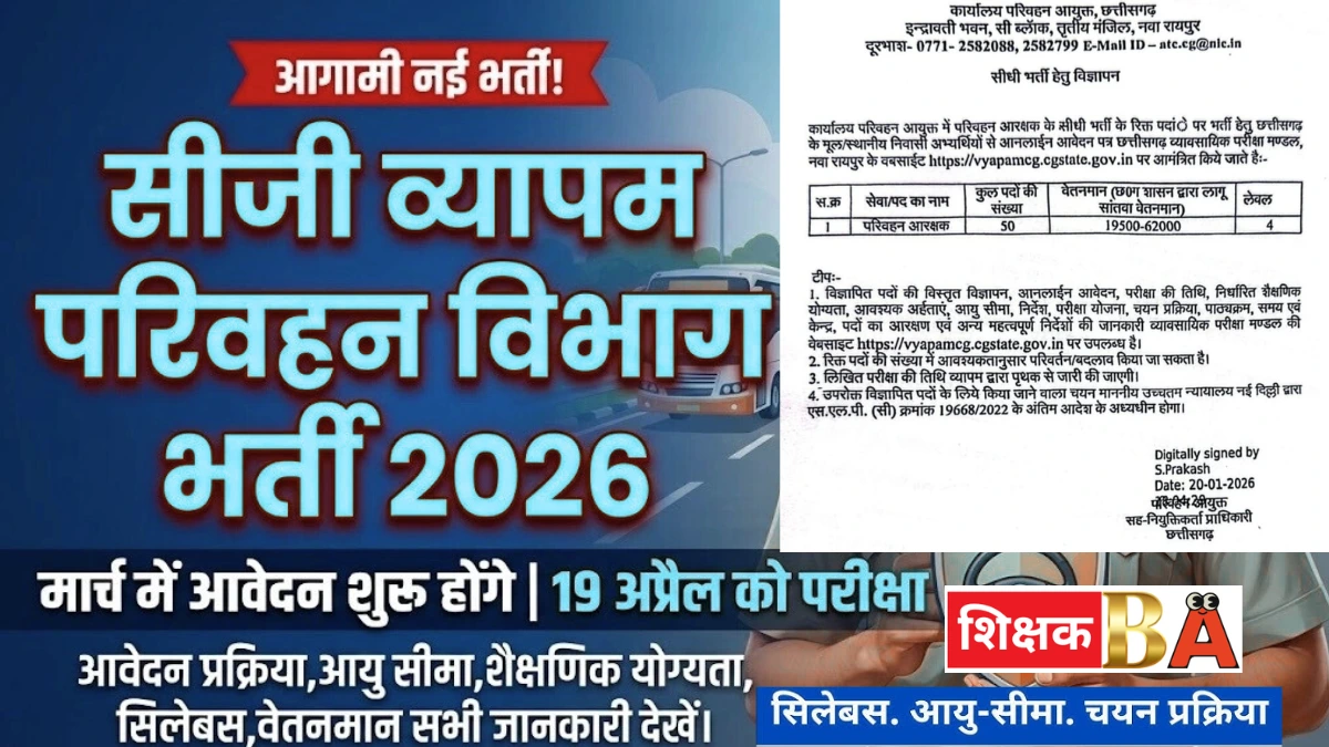 छत्तीसगढ़ के युवाओं के लिए एक बेहतरीन करियर अवसर उपलब्ध होने जा रहा है। छत्तीसगढ़ व्यावसायिक परीक्षा मंडल (CG Vyapam) द्वारा परिवहन आरक्षक (Transport Arakshak / Transport Guard) के पदों पर भर्ती प्रक्रिया वर्ष 2026 में शुरू होने वाली है। यह भर्ती क्षेत्रीय परिवहन अधिकारी (RTO) विभाग, छत्तीसगढ़ शासन के अंतर्गत होगी। जो उम्मीदवार 12वीं (10+2) पास हैं और एक सम्मानजनक, जिम्मेदारीपूर्ण व फील्ड-आधारित सरकारी नौकरी की तलाश में हैं, उनके लिए यह एक आदर्श अवसर साबित हो सकता है। परिवहन आरक्षक का पद सड़क सुरक्षा, यातायात प्रबंधन और कानून व्यवस्था से जुड़ा एक महत्वपूर्ण पद है, जो न केवल सरकारी सुरक्षा प्रदान करता है बल्कि समाज के प्रति सेवा का अवसर भी देता है।