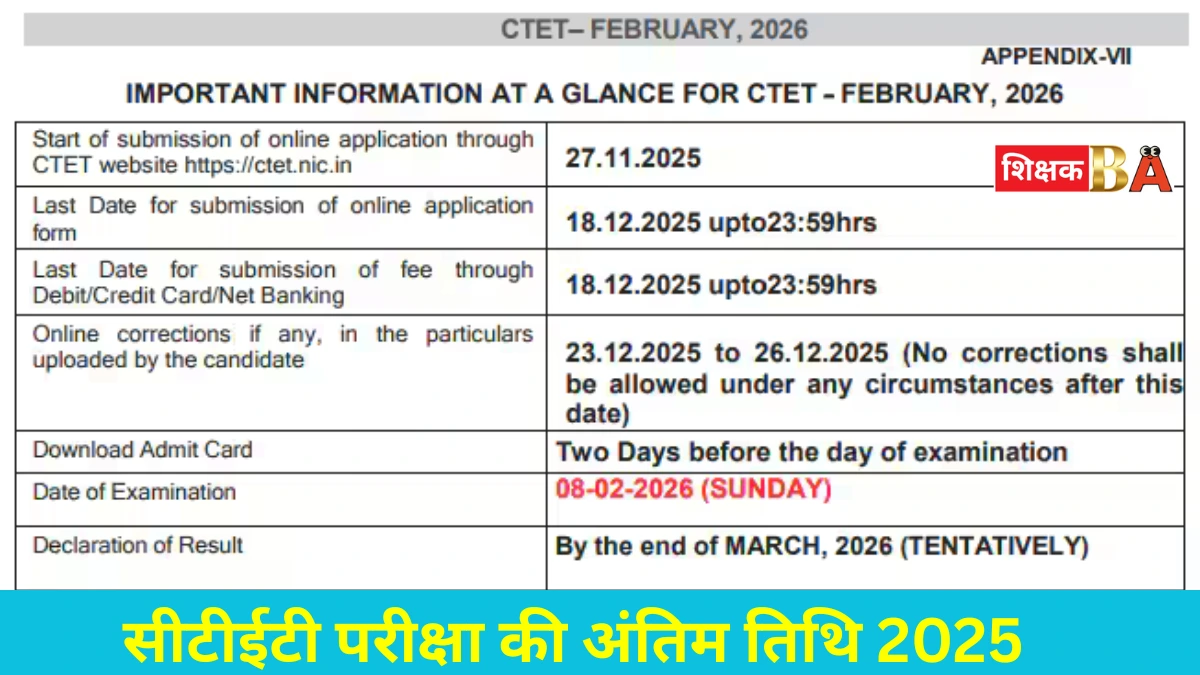 केंद्रीय शिक्षक पात्रता परीक्षा (CTET) 2026 के लिए आवेदन कर चुके उम्मीदवारों के लिए एक महत्वपूर्ण सूचना है। केंद्रीय माध्यमिक शिक्षा बोर्ड (CBSE) ने आवेदन पत्र में गलत भरी गई जानकारी को सुधारने का एक अंतिम अवसर प्रदान किया है। यह ‘सुधार की सुविधा’ (Correction Window) विशेष रूप से उन उम्मीदवारों के लिए है जिनसे आवेदन प्रक्रिया के दौरान कोई त्रुटि हो गई थी।