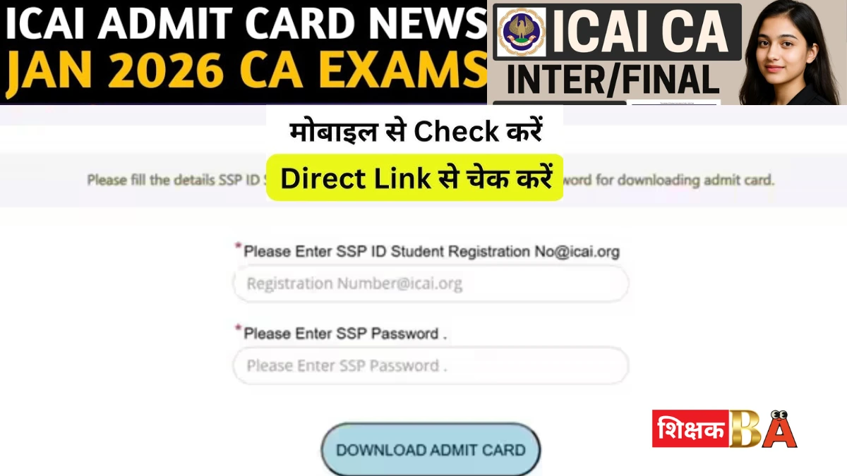 भारतीय चार्टर्ड एकाउंटेंट्स संस्थान (ICAI) ने जनवरी 2026 सत्र के लिए चार्टर्ड अकाउंटेंट (CA) की फाइनल, इंटरमीडिएट और फाउंडेशन परीक्षाओं के प्रवेश पत्र (Admit Card) जारी कर दिए हैं। जिन सभी अभ्यर्थियों ने इन परीक्षाओं के लिए सफलतापूर्वक आवेदन किया है, वे अब आधिकारिक वेबसाइट से अपना हॉल टिकट डाउनलोड कर सकते हैं। परीक्षा में प्रवेश के लिए यह प्रवेश पत्र एक अनिवार्य दस्तावेज़ है।