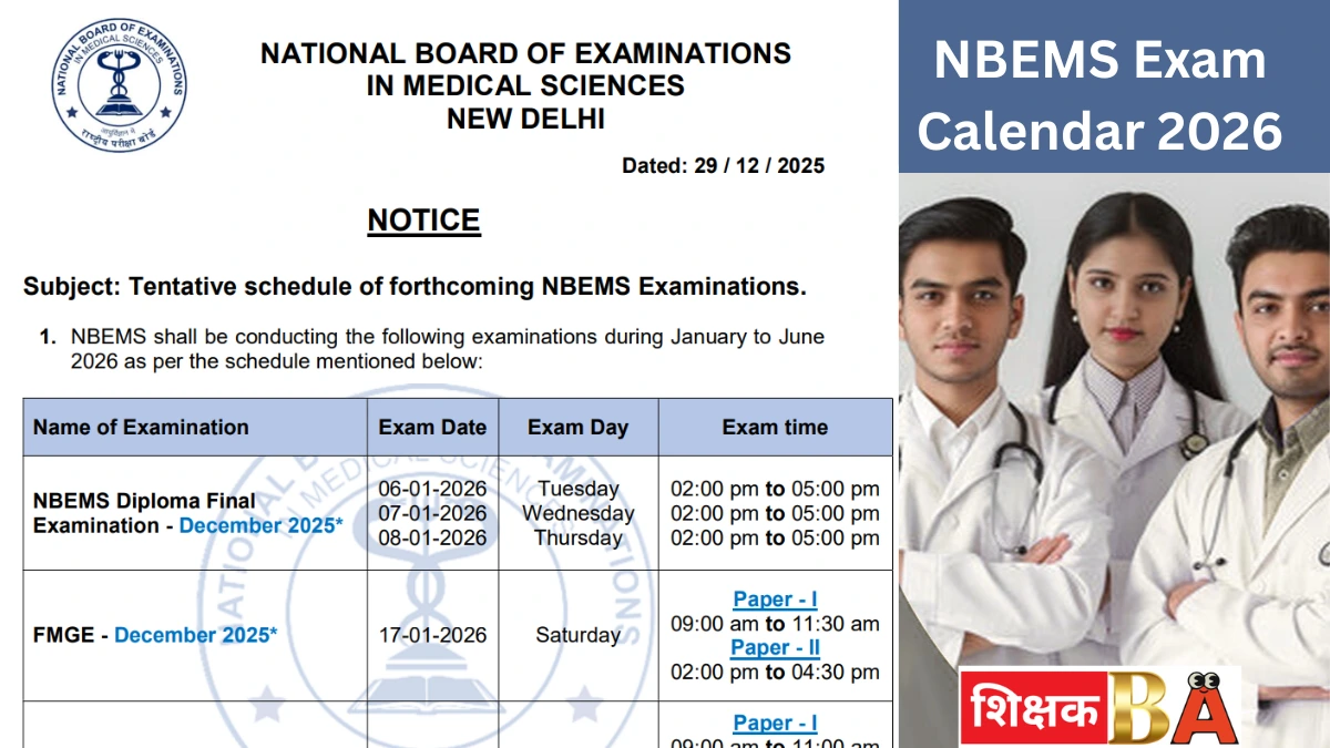 नेशनल बोर्ड ऑफ एग्जामिनेशन इन मेडिकल साइंसेज (NBEMS) ने वर्ष 2026 के पहले छह महीनों (जनवरी से जून) के लिए अपनी प्रमुख परीक्षाओं का संभावित कैलेंडर जारी कर दिया है। यह कैलेंडर चिकित्सा और फार्मेसी क्षेत्र की प्रमुख राष्ट्रीय स्तर की परीक्षाओं जैसे FMGE, GPAT, और विभिन्न DNB व डिप्लोमा परीक्षाओं की तिथियों का एक सामान्य खाका प्रस्तुत करता है।