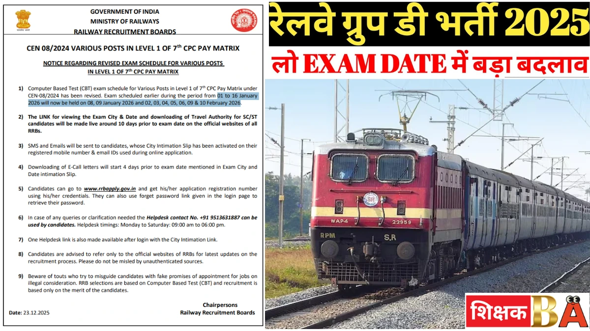 रेलवे भर्ती बोर्ड (आरआरबी) ने सीईएन 08/2024 के तहत ग्रुप डी लेवल-1 पदों की भर्ती के लिए संशोधित परीक्षा कार्यक्रम जारी कर दिया है। परीक्षा, जो पहले 1 से 16 जनवरी 2026 के बीच आयोजित होनी थी, अब 8 जनवरी से 10 फरवरी 2026 तक निर्धारित तिथियों पर होगी।