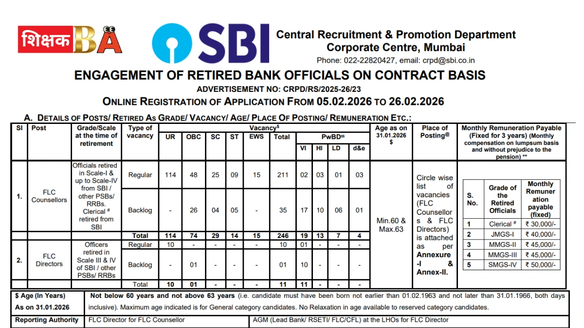 SBI FLC काउंसलर भर्ती 2026 उन अनुभवी बैंक अधिकारियों के लिए सुनहरा अवसर है जो समाज में वित्तीय जागरूकता फैलाने की इच्छा रखते हैं। यह पद सम्मान, स्थिर आय और सामाजिक योगदान का अनूठा संयोजन प्रदान करता है। यदि आप पात्र हैं, तो समय पर आवेदन करें और इंटरव्यू की तैयारी पूरी लगन से करें।