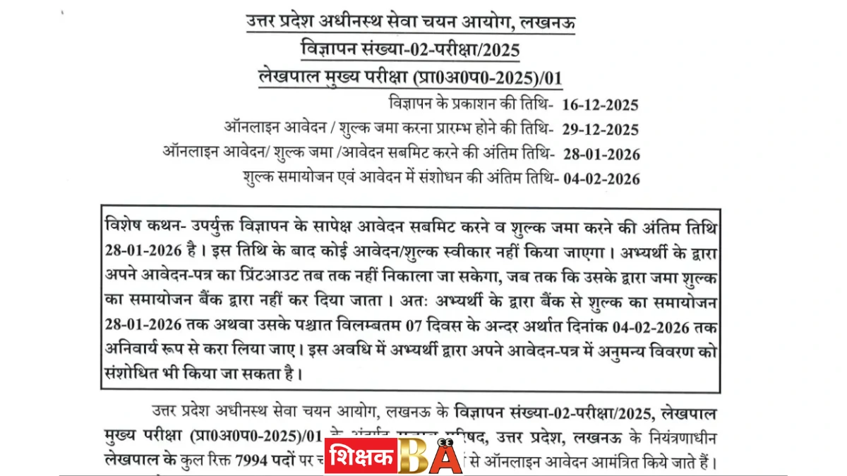 उत्तर प्रदेश अधीनस्थ सेवा चयन आयोग (UPSSSC) ने राज्य के लाखों युवाओं के लिए एक बड़ा करियर अवसर प्रस्तुत किया है। आयोग ने राजस्व विभाग में कुल 7,994 लेखपाल पदों पर भर्ती की अधिसूचना जारी की है। यह भर्ती विशेष रूप से इंटरमीडिएट (12वीं) पास उन युवाओं के लिए एक सुनहरा मौका है, जो सरकारी सेवा में जाना चाहते हैं और जिन्होंने यूपीएसएसएससी प्रारंभिक अर्हता परीक्षा (PET) 2025 उत्तीर्ण की है।